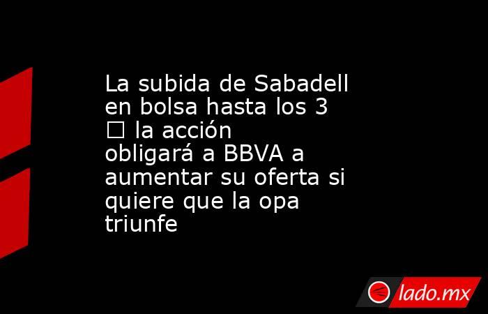 A los inversores les gusta Banco Sabadell, como lo demuestra su escalada en Bolsa hasta rebasar este miércoles los tres euros la acción, un umbral psicológico que el banco catalán no alcanzaba desde hace 16 años. Este movimiento alcista, además de marcar un hito bursátil para la entidad catalana, hace que pierda atractivo la oferta pública de adquisición (opa) lanzada sobre ella por BBVA. Esto es debido a que con la cotización actual, la prima de la opa se sitúa en un -12%, lo que representa una pérdida potencial para los accionistas del Sabadell que decidan acudir a la operación en las condiciones actuales.