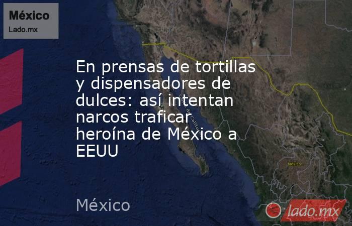 Seis paquetes de presunta heroína, con un peso total de 12.23 kilogramos, y un valor estimado de 517 mil 72 dólares, fueron hallados ocultos en prensas para tortillas y dispensadores de dulces dentro de una camioneta que intentaba ingresar desde México a Estados Unidos.