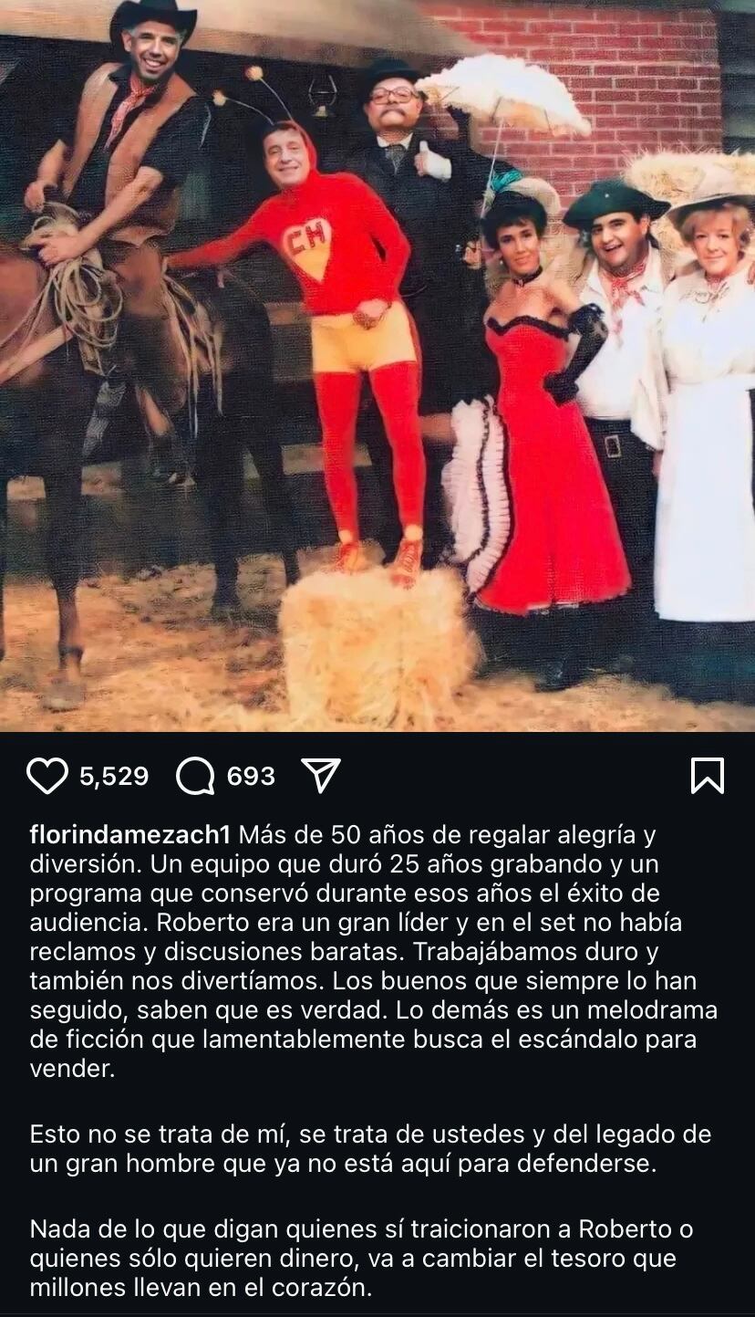 Florinda escribió en su publicación que Roberto era un líder en el set, donde no existían disputas innecesarias. Sin embargo, aprovechó para lanzar un mensaje directo a quienes en las últimas semanas han salido a hablar mal de su esposo, diciendo que son personas que “solo buscan el escándalo”para llamar la atención.