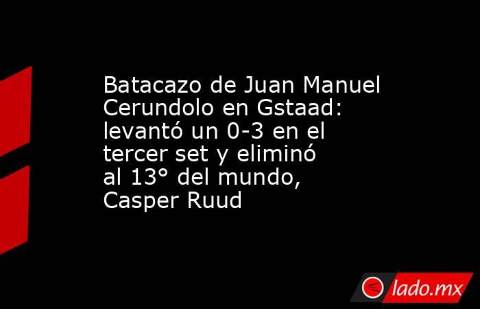Juan Manuel Cerúndolo dio el golpe ante Casper Ruud y obtuvo el triunfo más importante de su carrera para llegar a la semifinal del ATP 250 de Gstaad. El menor de los hermanos se impuso en tres sets y remontó el tercero después de estar 0-3 abajo, para firmar un 6-2, 1-6 y 6-3 ante el número 13 del mundo. Ahora, el argentino se medirá ante el peruano Ignacio Buse (167º), que llegó a meterse entre los mejores cuatro del certamen suizo tras eliminar en el primer turno del día a Román Burruchaga (136º).
