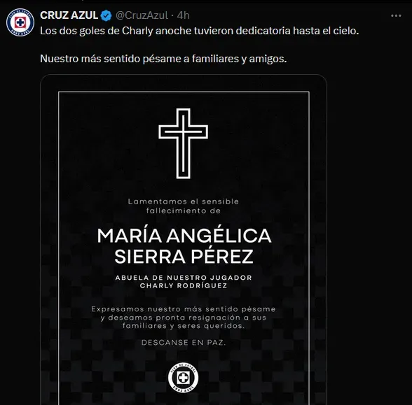“Lamentamos el sensible fallecimiento de María Angélica Sierra Pérez, abuela de nuestro jugador Charly Rodríguez.