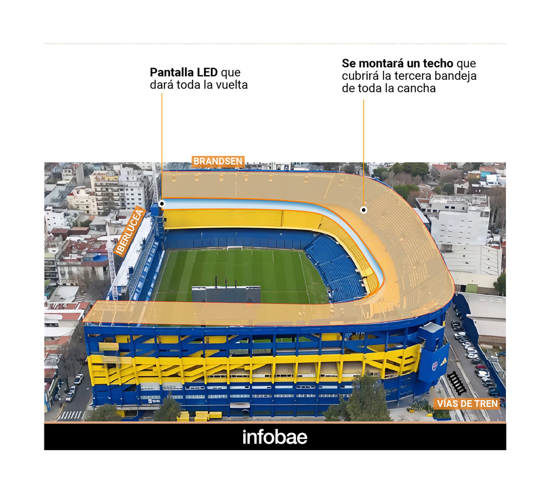 La nueva Bombonera tendrá otros chiches. Desde una pantalla led de 360° que recorrerá toda la cancha en su espacio interior hasta un techo que cubrirá la tercera bandeja popular en su totalidad. Hay que mencionar que el desarrollo de la obra más importante llevará al equipo a mudar su localía. Todavía no existen precisiones respecto al tiempo en el que Boca actuará fuera de su estadio, pero estiman que el período abarcará entre tres y seis meses. En tanto, no existen acuerdos con gobernaciones o clubes para jugar en otras canchas, pero las primeras alternativas que aparecen son el Único de La Plata (provincia de Buenos Aires), el Nuevo Gasómetro de San Lorenzo y el José Amalfitani de Vélez Sársfield (dentro de Capital Federal).