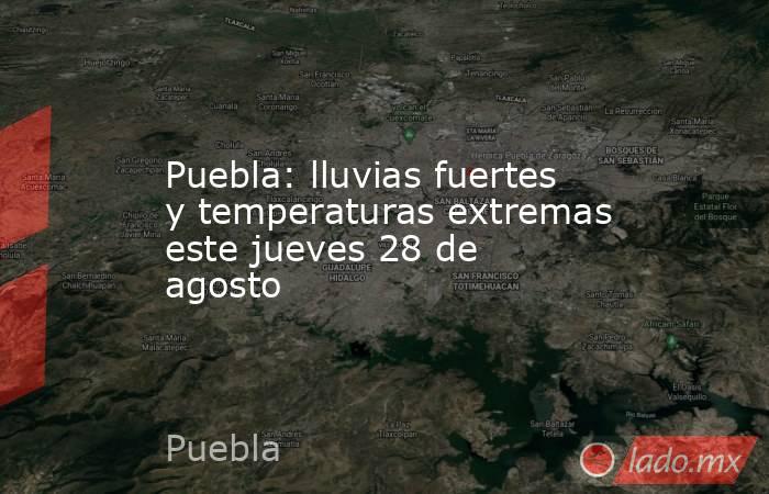 El Servicio Meteorológico Nacional de la Comisión Nacional del Agua (Conagua) informó que Puebla enfrentará lluvias fuertes de 25 a 50 milímetros este jueves 28 de agosto, con posibilidad de descargas eléctricas, granizo y encharcamientos en zonas bajas. Asimismo, se prevé viento con rachas de 40 a 60 km/h en el estado, por lo que se recomienda a la población extremar precauciones.
