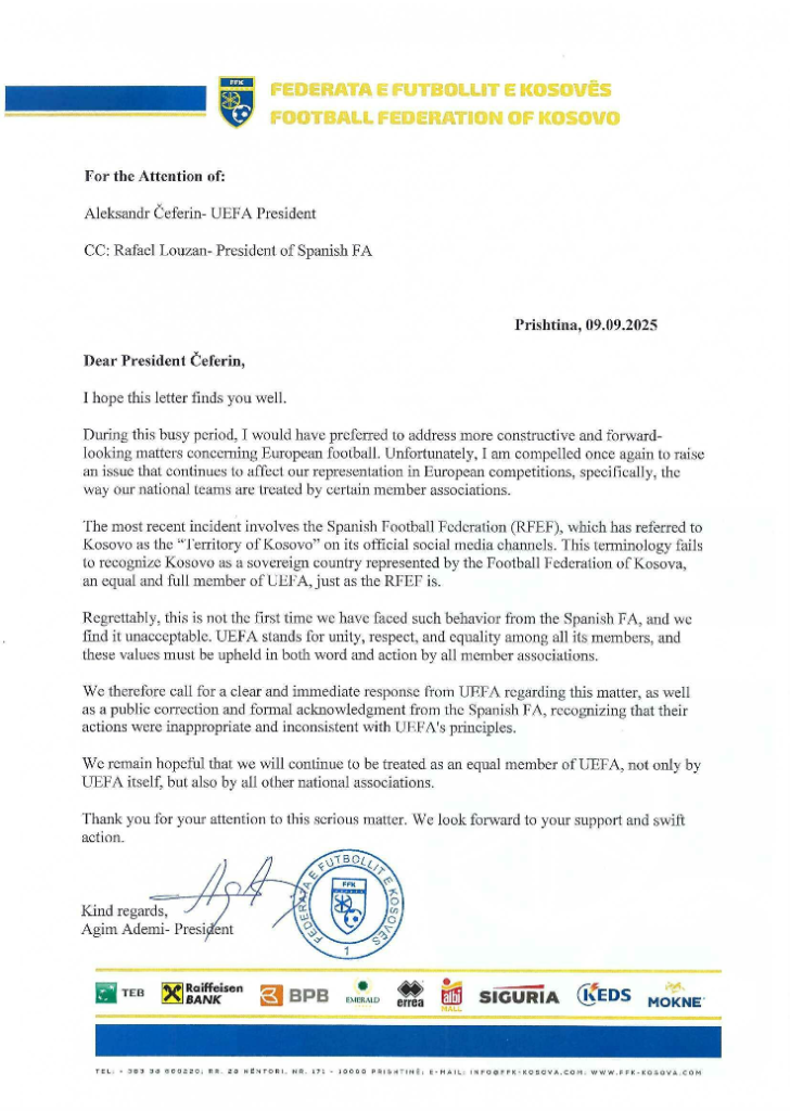 “El último caso se refiere a la Federación Española de Fútbol (RFEF), que en sus redes sociales oficiales se ha referido a Kosovo como el “Territorio de Kosovo”. Este enfoque niega la soberanía de Kosovo, que es un estado independiente y está representado por la Federación de Fútbol de Kosovo, miembro de pleno derecho e igualitario de la UEFA, al igual que la propia RFEF”.
