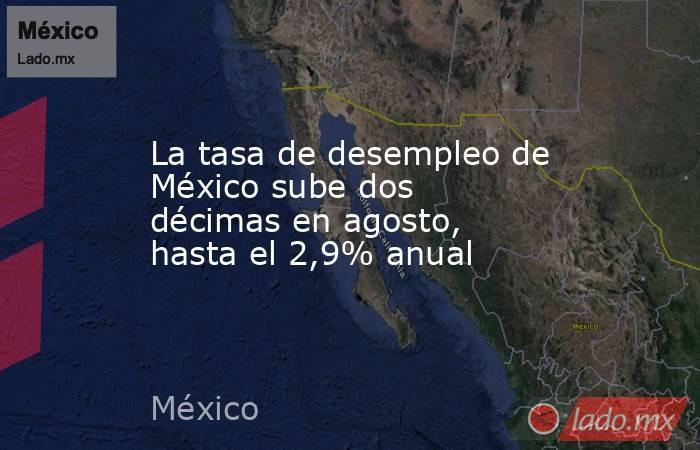 La tasa de desempleo de México ha aumentado dos décimas en agosto respecto al mes anterior, hasta situarse en el 2,9%, frente al 3% del mismo mes del año anterior, según los datos divulgados este lunes por el Instituto Nacional de Estadística y Geografía (INEGI).