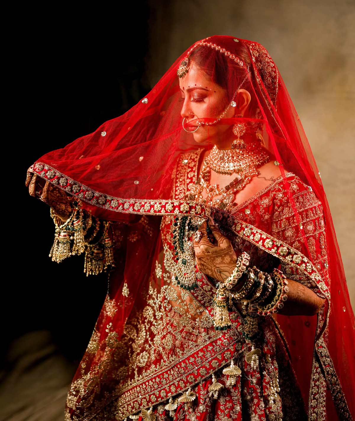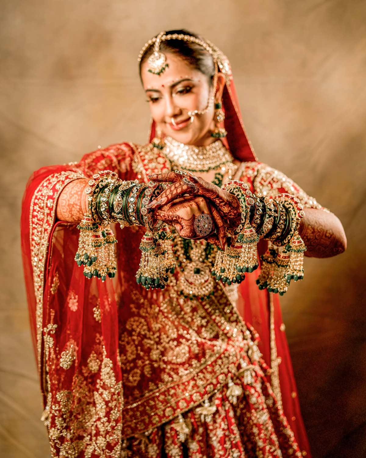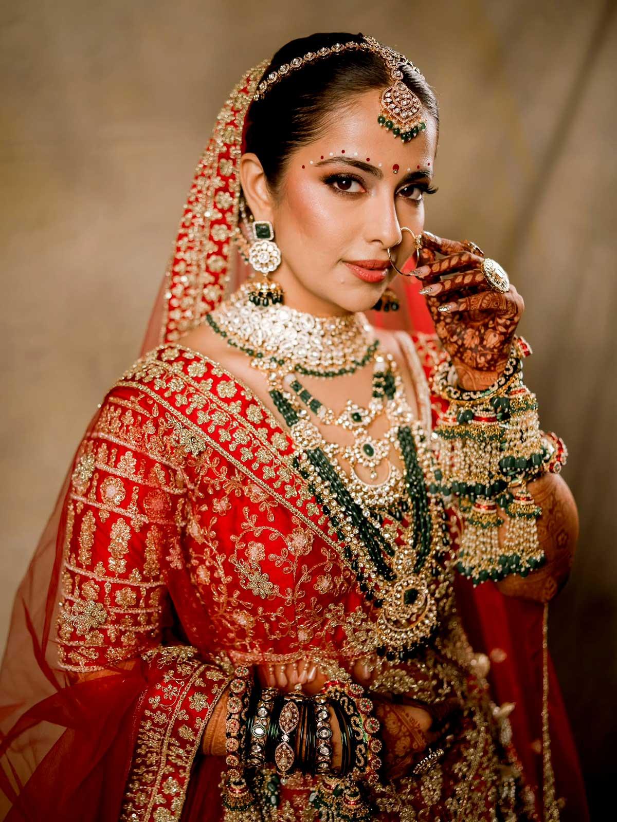 Avika parecía sorprendido en una lehenga roja, pronunciada con joyas esmeraldas. Milind lo completó en un accesorios regulares de Golden Sherwani y Mill Esmerald.