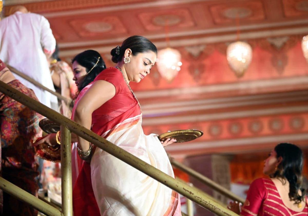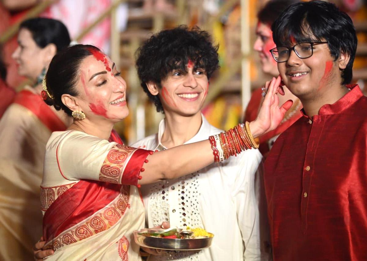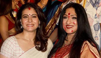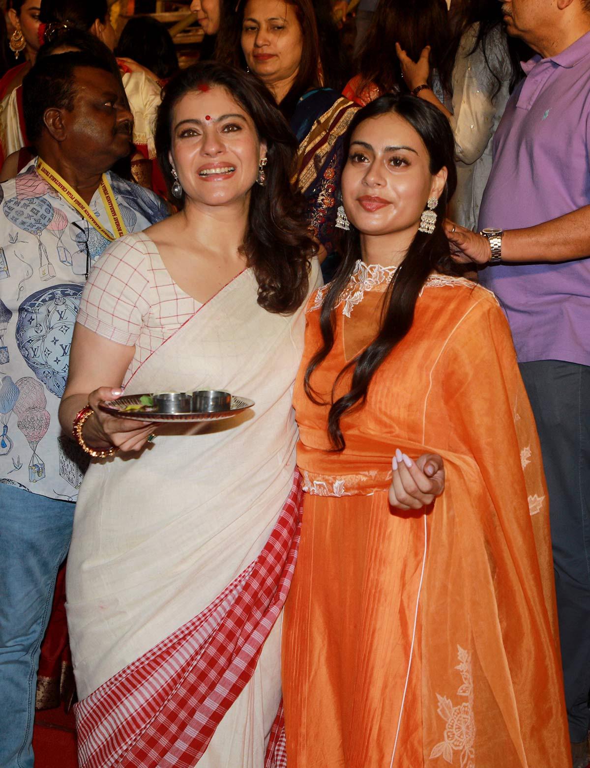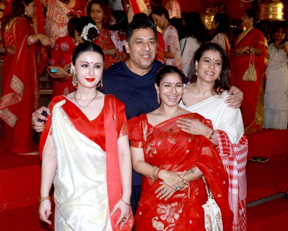 Kajal, su hija Nisa Devgan y su hermana Tanisha Mukherjee participaron en él Sindh Ceremonia en el North Bombay Sarbojanin Durga Puja.