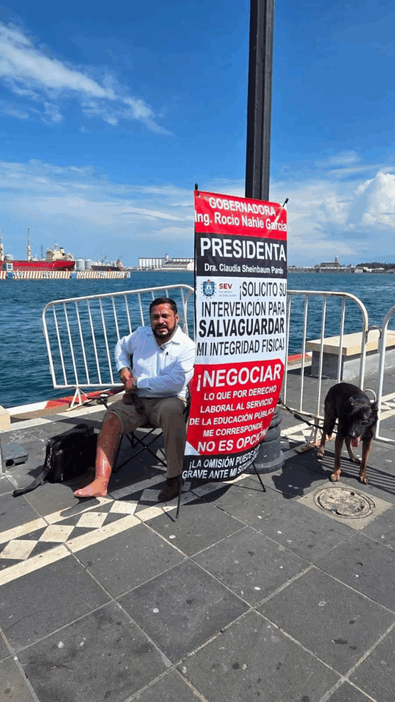 Encadenarse en la Macroplaza del Malecón en compañía de su perro “Rocky” es una estrategia, pues hay que recordar que este sábado 4 de octubre se realizará en ese mismo espacio la ceremonia del 204 Aniversario de la creación de la Armada de México, con la presencia de la presidenta, Claudia Sheinbaum Pardo.