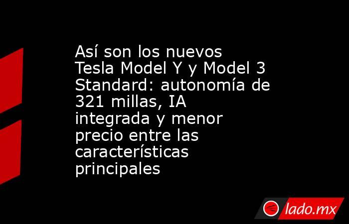 Los nuevos Model Y y Model 3 Standard ofrecen una autonomía de hasta 321 millas (516 kilómetros) por carga, con una batería de 69 kWh que cuenta con un módulo menos que los modelos Premium.