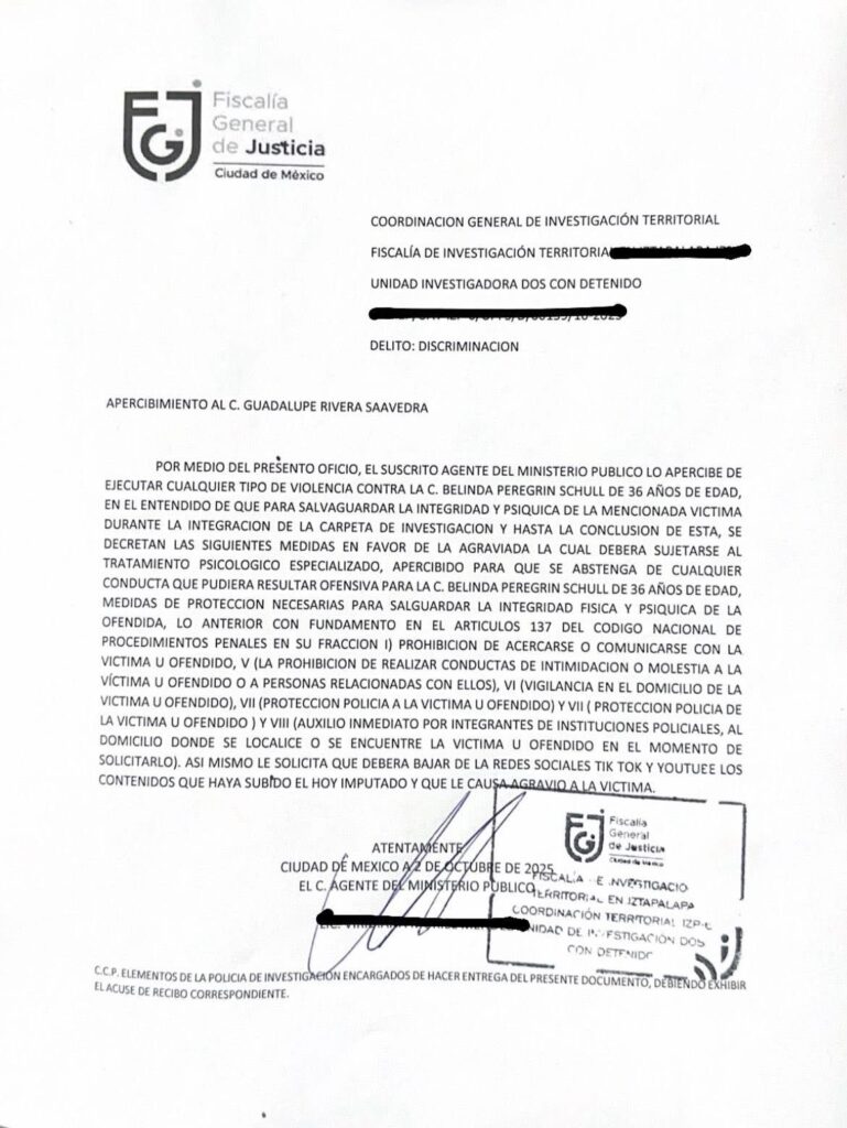 Se mencionó que en el marco de la carpeta de investigación en curso, la autoridad ministerial decretó medidas de protección en favor de la cantante y actriz Belinda Peregrín Schull, luego de que