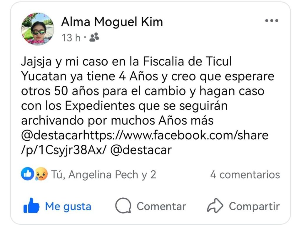 La víctima acudió a la Fiscalía de Ticul a presentar la denuncia correspondiente, aportando pruebas como grabaciones y testimonios. Sin embargo, hasta la fecha, no ha recibido respuesta ni avances en el proceso legal, lo que ha generado frustración y sospechas sobre posibles actos de corrupción, negligencia y encubrimiento por parte de las autoridades locales.