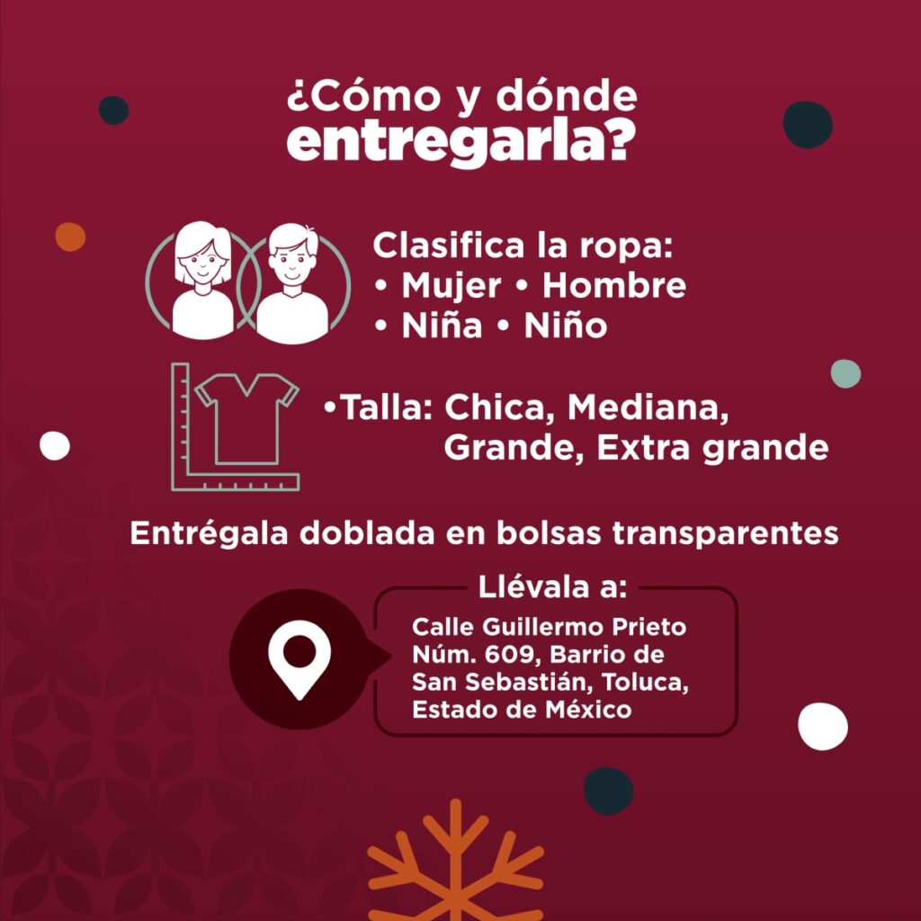 La campaña “Abriga un Corazón 2025” recibe todo tipo de prendas en buen estado, como suéteres, chamarras, bufandas, gorros, guantes, rebozos y cobertores. El centro de acopio principal se encuentra en Toluca, donde las donaciones se canalizan directamente a comunidades que más lo necesitan.