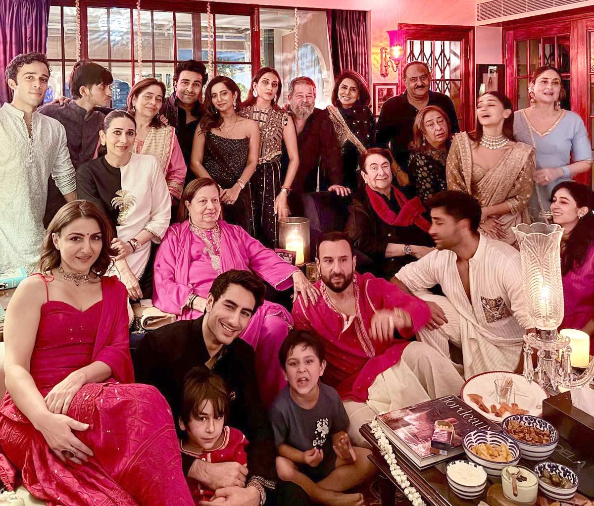 Sentados, de izquierda a derecha: Soha Ali Khan, Karisma, Ibrahim, Taimur, Jeh, Saif, Randhir Kapoor, el hijo mayor de Raj Kapoor, Reema, Armaan, Alia y Shaira.
