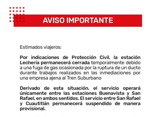 Una fuerte fuga de gas natural registrada la mañana de este viernes al exterior de la estación Lechería del Tren Suburbano provocó la suspensión total del servicio y la evacuación preventiva de usuarios y personal de la zona.