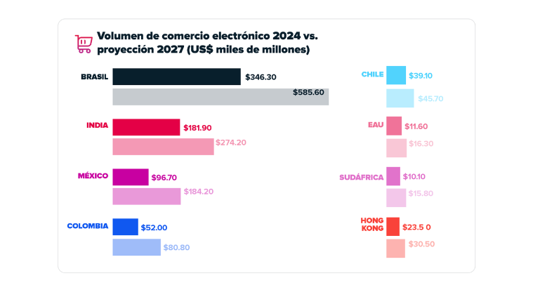 De acuerdo con el estudio, el comercio electrónico en los mercados emergentes analizados superará 1.2 billones de dólares para 2027, con un crecimiento anual del 19%, casi el doble del promedio de las economías desarrolladas.