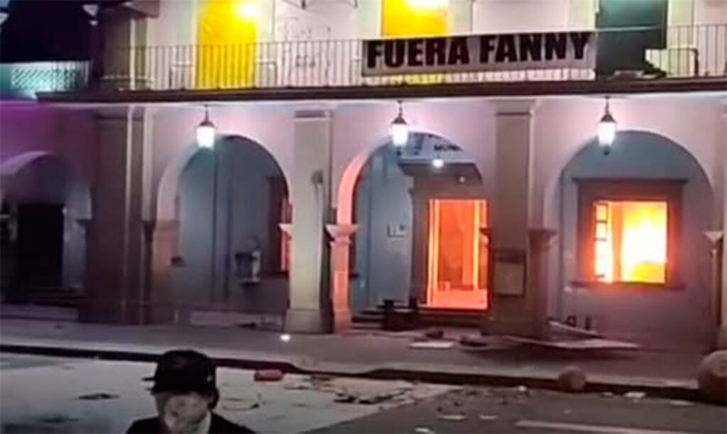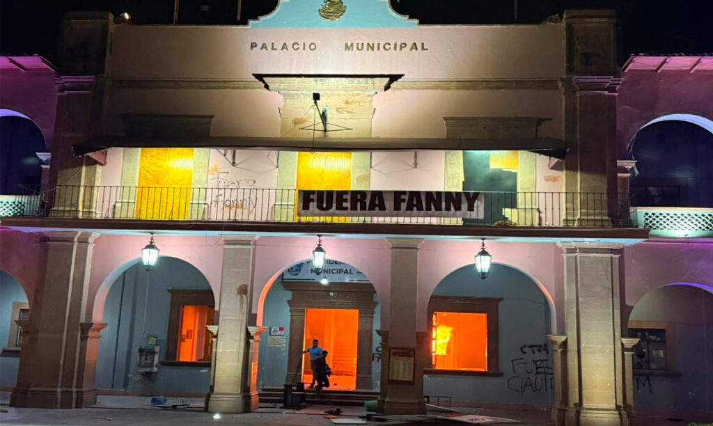 Acto seguido por la fuerza varios encapuchados ingresaron a las instalaciones municipales a destrozar mobiliario y prendieron fuego en algunas áreas al interior, subieron al segundo piso donde continuaron los destrozos y colocaron una manta en el barandal con la leyenda “Fuera Fanny”. El palacio municipal fue destrozado.