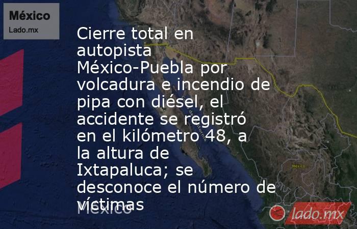 IXTAPALUCA, Estado de México.- Un tractocamión tipo pipa cargado con diésel se volcó y se incendió la tarde de este sábado en la autopista México-Puebla, lo que provocó el cierre total de la vialidad en ambos sentidos, informó Caminos y Puentes Federales (Capufe).
