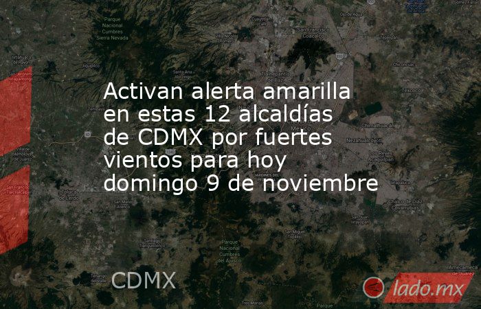 Se trata de las alcaldías: Álvaro Obregón, Azcapotzalco, Benito Juárez, Coyoacán, Cuauhtémoc, Gustavo A. Madero, Iztacalco, Iztapalapa, Miguel Hidalgo, Tláhuac, Venustiano Carranza y Xochimilco, las que registrarán fuertes vientos para la tarde y noche de este domingo 9 de noviembre.
