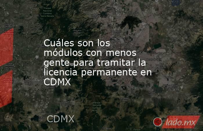 Para encontrar módulos con menos gente para tramitar la licencia permanente en la Ciudad de México, se sugiere considerar las siguientes opciones las cuales han sido reportadas con menos gente o más eficientes en la realización del trámite de acuerdo con diversos usuarios en redes sociales: