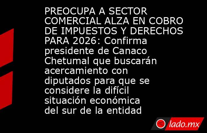 - Al aclarar que hasta el momento la Comisión de Desarrollo Económico que preside la diputada María José Osorio en el Congreso no ha tenido ningún acercamiento con el sector comercial y empresarial de la zona sur, el presidente de la Canaco Chetumal, Amir Padilla Espadas, anticipó que se conformará un […]The post PREOCUPA A SECTOR COMERCIAL ALZA EN COBRO DE IMPUESTOS Y DERECHOS PARA 2026: Confirma presidente de Canaco Chetumal que buscarán acercamiento con diputados para que se considere la difícil situación económica del sur de la entidad appeared first on Noticaribe.