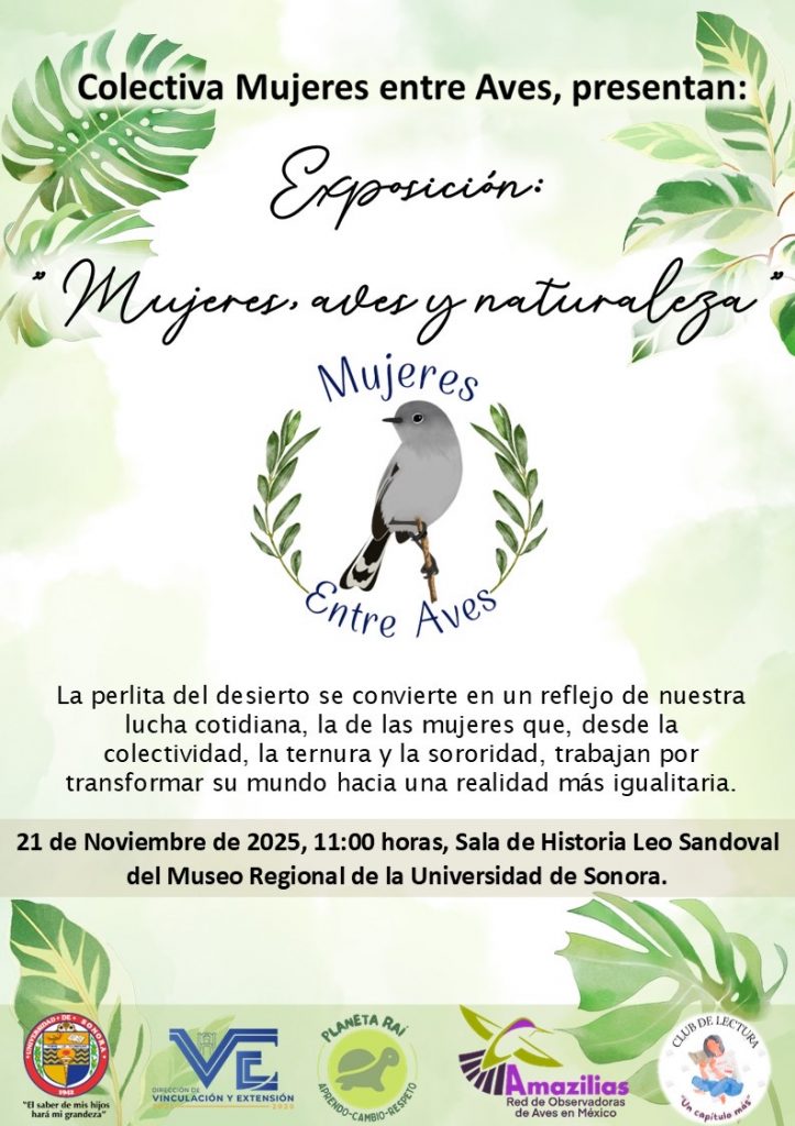 Hermosillo, Sonora.– La colectiva Mujeres entre Aves inauguró este 21 de noviembre de 2025 la exposición “Mujeres, aves y naturaleza”, una muestra que combina arte, observación de aves y reflexión social para destacar el papel de las mujeres en la vida comunitaria y en la conservación del entorno natural.