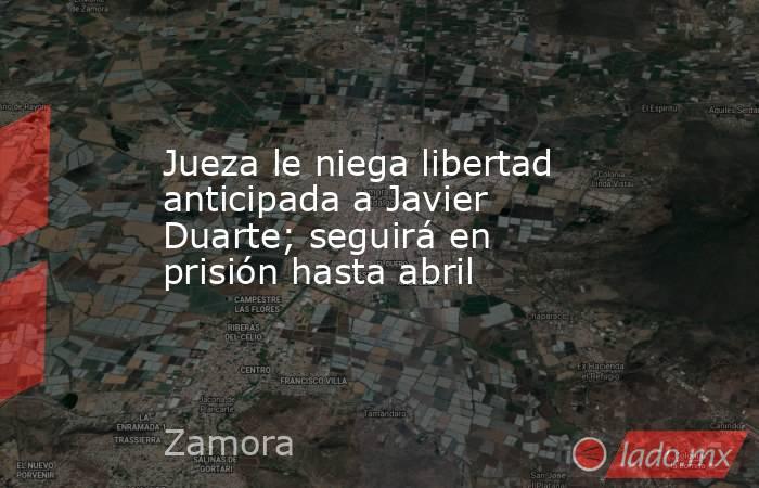 La defensa de Javier Duarte, encabezada por Pablo Campuzano, informó que acatará la decisión de la jueza y evaluará tiempos para apelar El exgobernador de Veracruz, Javier Duarte de Ochoa, continuará tras las rejas, luego de que la jueza Ángela Zamorano Herrera negara este viernes su solicitud de libertad anticipada.