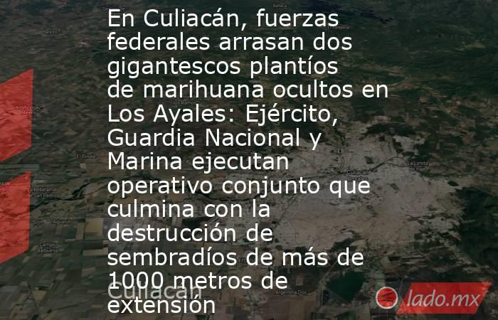 Este 22 de noviembre de 2025, en el poblado Los Ayales, Culiacán, un Grupo Interinstitucional conformado por el Ejército Mexicano, la Guardia Nacional, la Secretaría de Marina, la Secretaría de Seguridad y Protección Ciudadana, la Fiscalía General de la República, la Fiscalía General del Estado y la Secretaría de Seguridad Pública de Sinaloa, a través de la Policía Estatal Preventiva, localizó y destruyó dos extensos plantíos de marihuana.