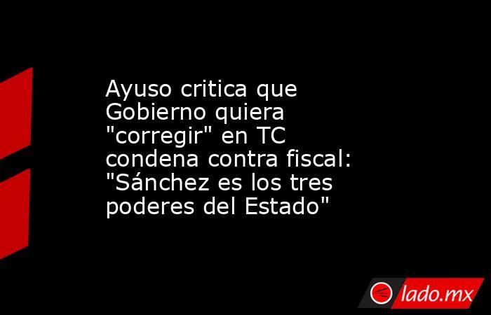 La presidenta de la Comunidad de Madrid, Isabel Díaz Ayuso, ha criticado este lunes que el Gobierno de la nación quiera "corregir" la sentencia contra el fiscal general del Estado, Álvaro García Ortiz, en el Tribunal Constitucional al denunciar que el presidente del Gobierno, Pedro Sánchez, crea que representa "los tres poderes del Estado".