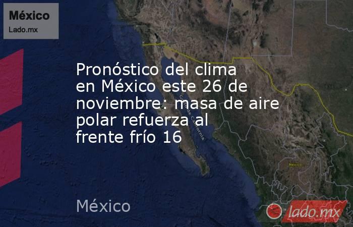 El frente frío número 16 será reforzado por una masa de aire polar proveniente del noroeste de Canadá, por lo que se desplazará gradualmente sobre el oriente del territorio nacional, en interacción con un canal de baja presión sobre el suroeste del golfo de México y el sureste del país, ocasionarán lluvias fuertes a muy fuertes en el noreste, oriente y sureste del país, incluida la península de Yucatán, pronosticándose lluvias puntuales intensas en zonas de: