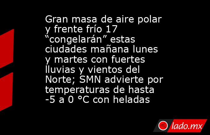 CIUDAD DE MÉXICO.- El Servicio Meteorológico Nacional (SMN) informó que durante el lunes y martes, el frente frío número 17 continuará avanzando sobre el noroeste del golfo de México y el oriente del país, provocando lluvias, ambiente frío y vientos intensos en distintas regiones.