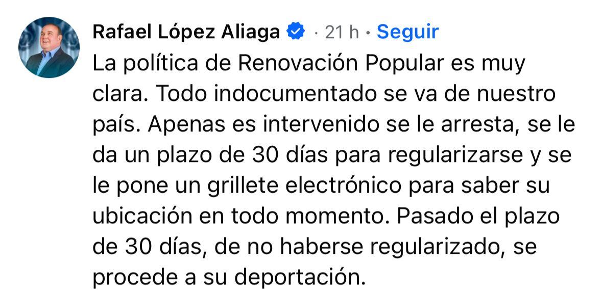 “Todo indocumentado se va. Apenas es intervenido se le arresta, se le da un plazo de 30 días para regularizarse y se le pone un grillete electrónico para saber su ubicación en todo momento. Pasado el plazo de 30 días, de no haberse regularizado, se procede a su deportación”, señaló en una publicación de Facebook.
