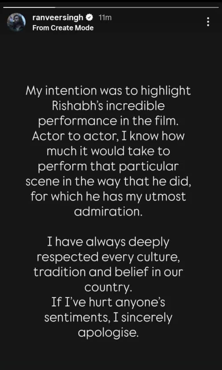 El martes por la mañana, Ranveer visitó Instagram y compartió una nota de disculpa en Stories. Dijo: “Mi intención era resaltar la increíble actuación de Rishabh en la película. De actor a actor, sé cuánto se necesita para lograr esa escena en particular de la forma en que lo hizo él, por lo que tiene mi mayor aprecio”. También escribió: “Siempre he respetado profundamente cada cultura, tradición y creencia de nuestro país. Si he herido los sentimientos de alguien, me disculpo sinceramente”.