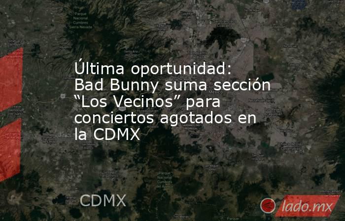 La promotora Ocesa anunció una nueva sección de boletos llamada “Los Vecinos” para las ocho fechas de Bad Bunny en el Estadio GNP Seguros en la Ciudad de México. La información fue confirmada por la propia promotora y por la venta anunciada en Ticketmaster. Esta apertura es la última oportunidad para conseguir entradas para los shows que ya registraron sold out desde la preventa.