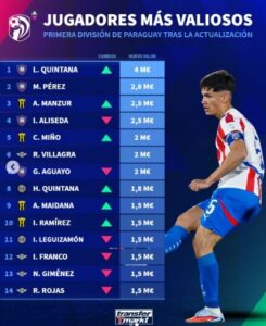 Otros jugadores de interesante cotización son Matías Pérez (USD 2.8 millones), Agustín Manzur (2.5 millones), César Miño (USD 2 millones), Alexandro Maidana (USD 1.8 millones) e Iván Ramírez (USD 1.5 millones), entre otros.