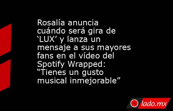 El final de 2025 en el mundo de la música ha estado marcado por el lanzamiento de LUX, el cuarto disco de Rosalía. La cantante catalana ha llegado algo tarde para figurar entre los músicos más escuchados del mundo en el Spotify Wrapped de este 2025, pero para aquellos oyentes que la han tenido como su artista más reproducida, ha dedicado un vídeo lleno de entusiasmo, agradecimiento y complicidad. “Querido, me alegro mucho por ti de que te esté saliendo este video porque esto significa que tienes un gusto musical impoluto e inmejorable”, declara con un tono desenfadado.