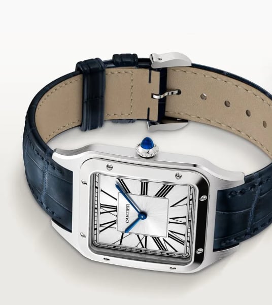 El reloj que Emily obsequió a su pareja responde al modelo Santos-Dumont de Cartier, reconocido por su diseño elegante, caja de acero, esfera plateada con efecto “rayos de sol”, números romanos y cristal de zafiro. La versión con diamantes, como la que aparece en la fotografía, eleva su valor original —ya alto por sí mismo—, colocándolo por encima de los 150 mil pesos mexicanos.