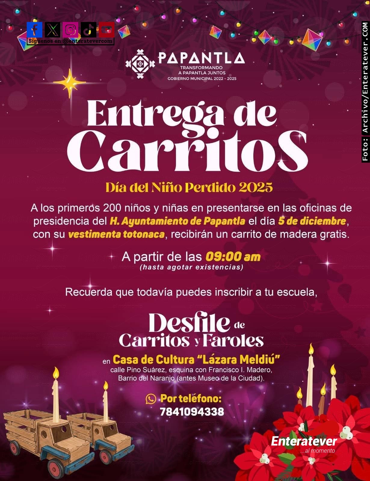El recorrido está programado para el día domingo 7 de diciembre a las seis de la tarde, comenzando desde la avenida 16 de septiembre. Cabe señalar que el gobierno municipal estará entregando algunos carritos de madera a los niños que acudan al Ayuntamiento con vestimenta Totonaca el día viernes a las nueve de la mañana.