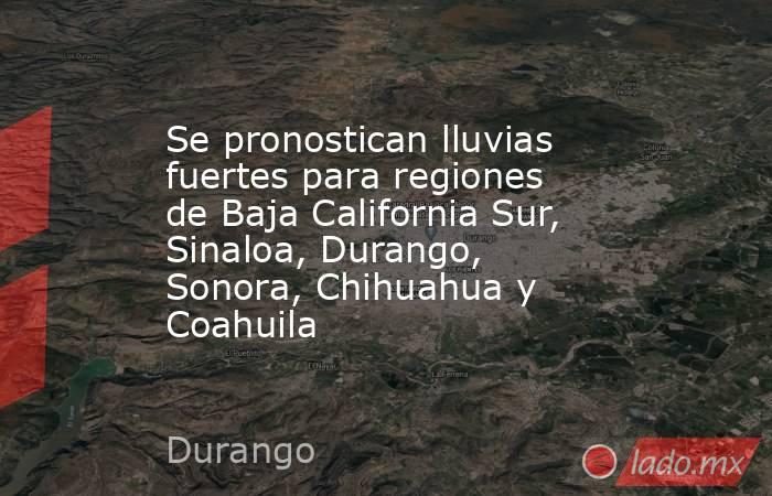 Para esta noche y la madrugada del viernes se pronostican lluvias puntuales fuertes (de 25 a 50 milímetros [mm]) para regiones de Baja California Sur, Sinaloa, Durango, Sonora, Chihuahua y Coahuila, e intervalos de chubascos (de 5 a 25 mm) en Nuevo León, Tamaulipas, San Luis Potosí (regiones Altiplano, Media y Huasteca), Nayarit, Querétaro (región Sierra Gorda), Hidalgo (regiones Sierra Alta, Huasteca y Sierra Gorda), Veracruz (regiones Huasteca Alta, Huasteca Baja, Totonaca, Nautla, Los Tuxtlas y Olmeca) y Puebla (regiones Sierra Norte y Sierra Nororiental), Estado de México, Guerrero, Oaxaca, Chiapas y Quintana Roo.