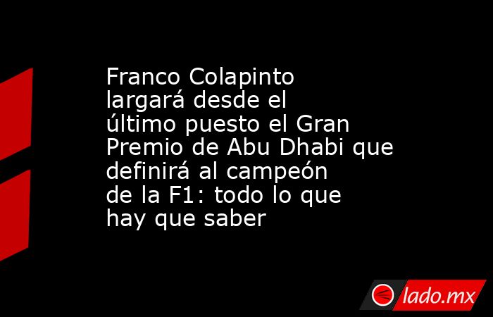 Bienvenidos al minuto a minuto del Gran Premio de Abu Dhabi de la Fórmula 1 con la participación de Franco Colapinto y la definición por el título de pilotos.