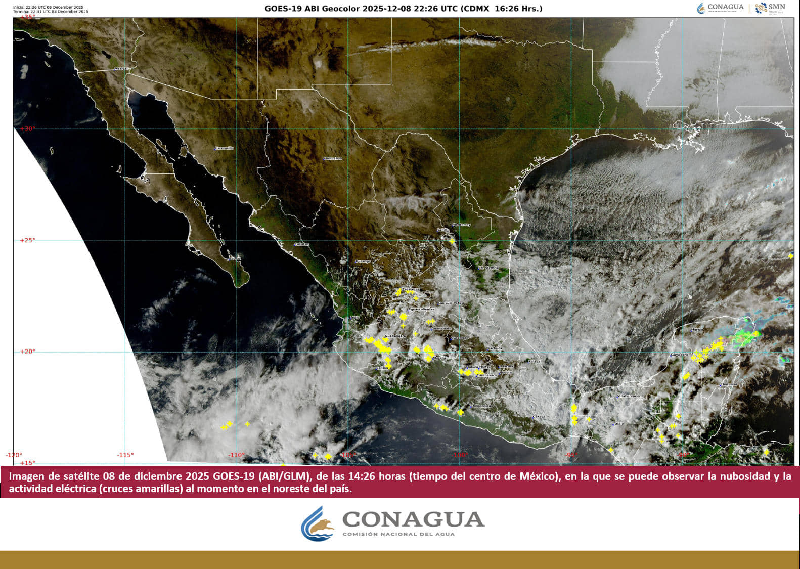 La inestabilidad atmosférica también provocará intervalos de chubascos con descargas eléctricas en zonas del occidente, centro, oriente y sur del país, incluido el Valle de México. Estados como Jalisco, Michoacán, Puebla, Morelos, Ciudad de México y Estado de México podrían registrar estas precipitaciones. Además, se prevén bancos de niebla en zonas altas del oriente y sureste.