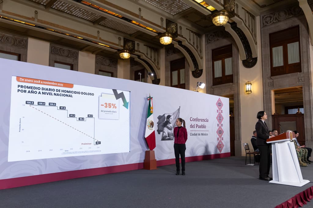 La funcionaria señaló que en estos 14 meses se ha mantenido una tendencia a la baja en el homicidio doloso. Además, comparado con 2018, el promedio diario anual disminuyó 35%, al pasar de 100.5 a 65.1, lo que perfila a 2025 como el año con menos homicidios registrados en el país.