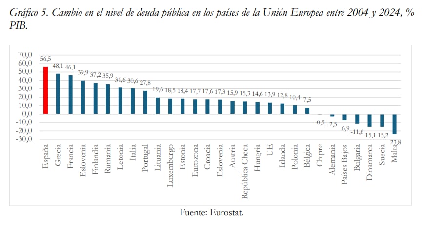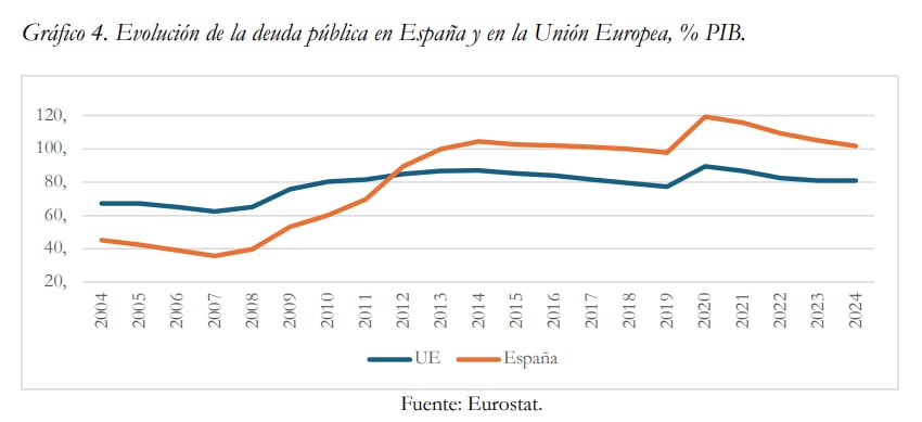 Sus autores inciden en que en las dos últimas décadas, la deuda pasó del 45,3% en 2004, al 101,8% el año pasado, lo que supone “el mayor salto de entre todas las grandes economías de la UE”. Como resultado, el margen fiscal del que goza España en caso de enfrentar una nueva crisis “es escaso”, reconocen. Aseguran que “nuestra posición de partida para afrontar los costes del acelerado y acusado envejecimiento de la población no puede ser más frágil”.