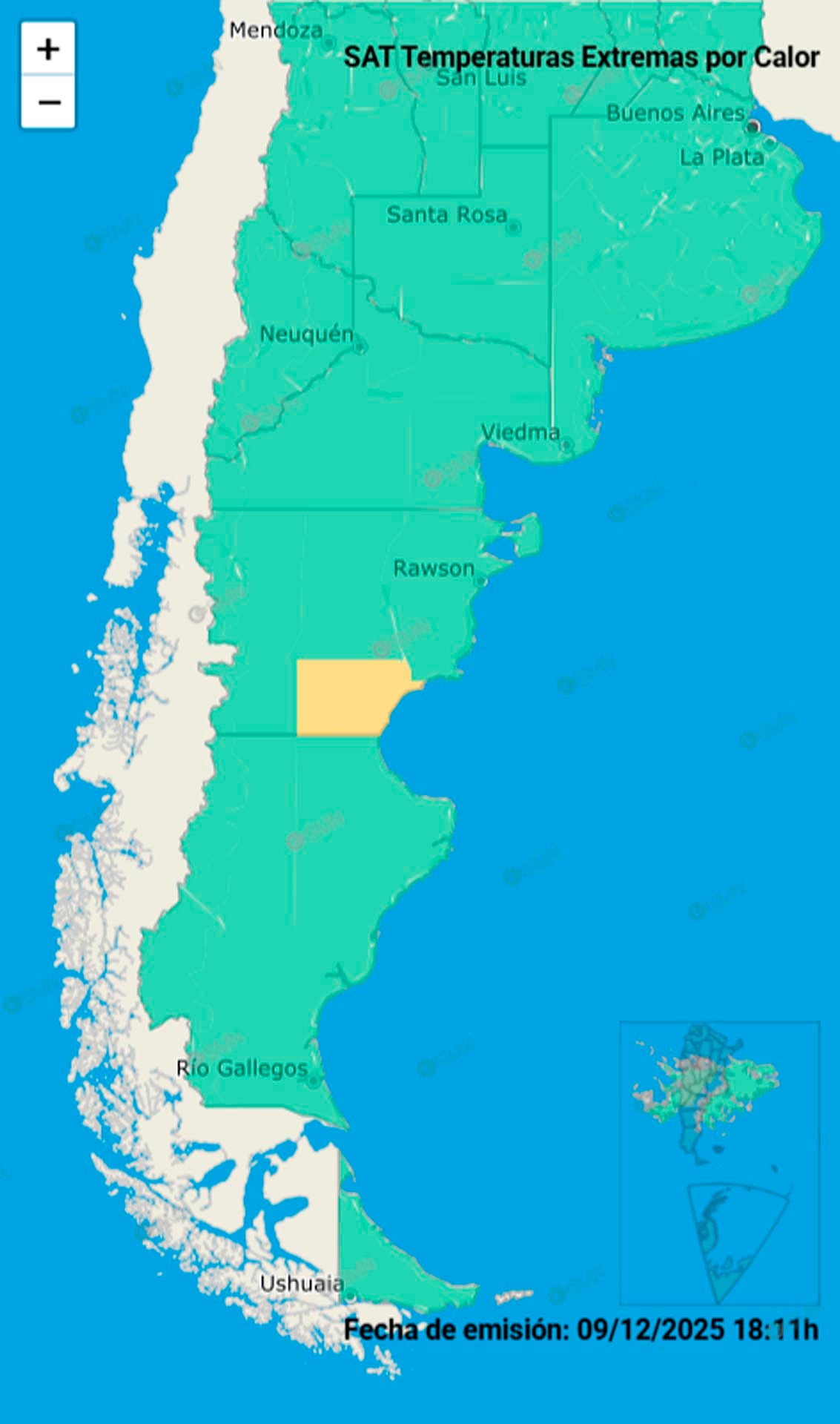 Además, hay alerta amarilla por temperatura extrema por calor al sureste de Chubut y afectará a localidades como Sarmiento y Comodoro Rivadavia.