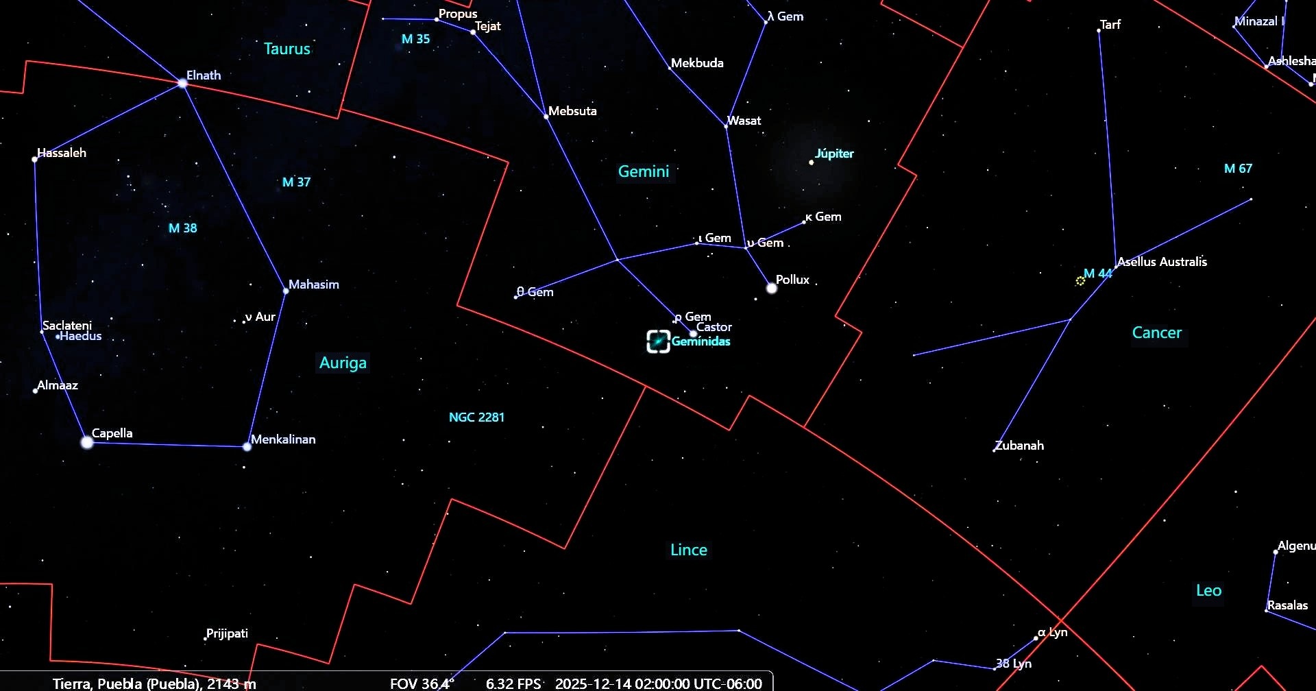 Desde mediados del siglo XIX, el cielo de diciembre se ilumina con los fugaces destellos de la lluvia de meteoritos Gemínidas y desde entonces se ha convertido en un evento anual. Durante su punto máximo, que ocurre alrededor de mediados del mes, se pueden observar hasta 120 meteoros por hora en condiciones ideales. Las Gemínidas destacan por ser brillantes y rápidas, y tener un color amarillo. De acuerdo con la NASA, estos meteoros provienen de partículas de cometas y fragmentos de asteroides. Al orbitar el Sol, dejan una estela de polvo. Cada año, la Tierra la atraviesa y los fragmentos chocan con la atmósfera terrestre, lo que genera vetas brillantes y coloridas en el cielo. A diferencia de otras lluvias de meteoros que tienen origen en cometas, ésta proviene del asteroide 3200 Faetón, el cual tarda 1.4 años en orbitar el Sol, y según expertos, es posible que sea un “cometa muerto” o un nuevo tipo de objeto llamado “cometa rocoso”. Los fragmentos (2-3 g/cc) que se desprenden para formar los meteoroides Gemínidas son varias veces más densos que los copos de polvo cometario (0,3 g/cc). De acuerdo con la NASA, la lluvia de meteoros alcanzará su punto máximo en las noches del 13 y 14 de diciembre, las cuales podrán observarse cerca de Júpiter. “El mejor momento para observarla será a partir del anochecer del 13 y las primeras horas del día 14, hacia la parte este de la esfera celeste”, segíun el Instituto Nacional de Astrofísica, Óptica y Electrónica (INAOE) de México, el cual estima una tasa observable de 120 meteoros por hora. De acuerdo con la UNAM, la lluvia de meteoros Gemínidas ocurrirá entre las 22:00 horas del 12, y las 04:00 horas del 14 de diciembre, con una visibilidad excelente si las condiciones lo permiten. La lluvia de emínidas es un evento fugaz en el que las luces aparecen y desaparecen rápido en el cielo, por eso hay que tomar algunas consideraciones para observarlas y, en su caso, fotografiarlas. La NASA recomienda prepararse para observarlas durante el pico, que será entre la noche del 13 de diciembre al amanecer del 14. De preferencia, alejarse de las luces de la ciudad y buscar un lugar con cielos despejados y oscuros, para percibir con mayor claridad el paso de los meteoritos. Para tomar fotografías, recomienda: - Utilizar un trípode para mantener estabilidad en la cámara y reducir las vibraciones del viento. - Utilizar una lente gran angular para capturar una mayor parte del cielo. Un teleobjetivo solo puede capturar poco espacio, y hay menos probabilidades de fotografiar un meteoro. - Utilizar un cable disparador o el temporizador para evitar tocar la cámara y causar vibraciones que alteren la calidad de la imagen. - Usar enfoque manual. - Calcular el tiempo de exposición para capturar el movimiento. Si quieres evitar el aparente movimiento de las estrellas, puedes seguir la regla del 500. Divide 500 entre la longitud en milímetros de tu objetivo. El resultado es el tiempo en segundos que puedes mantener abierto el obturador antes de ver estelas de estrellas. Por ejemplo, si usas un objetivo de 20 mm, 25 segundos (500 dividido entre 20) es el tiempo máximo de exposición que puedes establecer antes de que empiecen a aparecer estelas de estrellas en tus imágenes. La razón de su nombre está en su radiante, o el punto celeste del que parece provenir, que es la constelación de Géminis, las “Gemelas”. Sin embargo, esta no es la fuente de los meteoros, y también pueden observarse en todo el cielo nocturno.