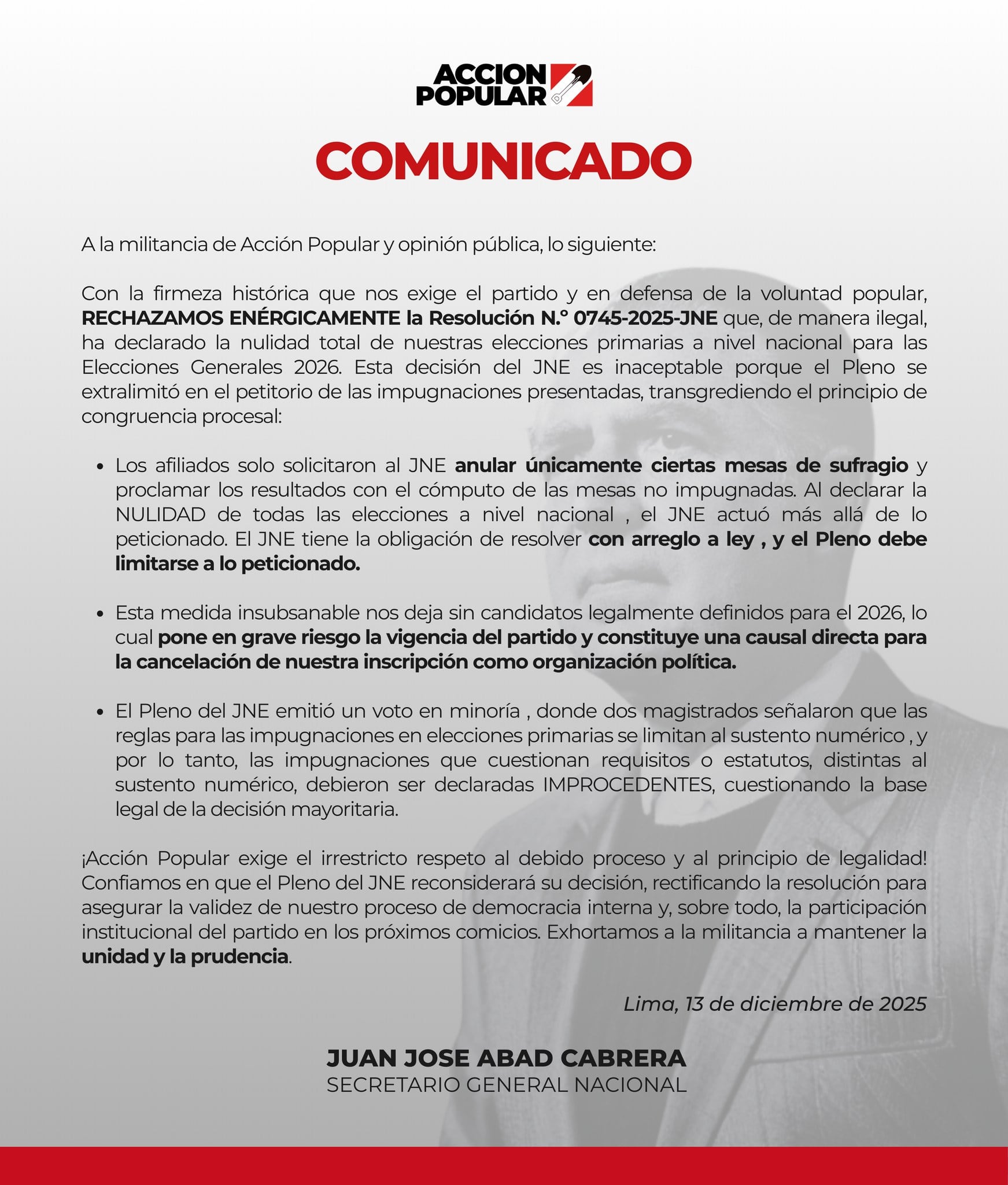 El partido político Acción Popular respondió este domingo calificando de ilegal la decisión del Jurado Nacional de Elecciones (JNE) que anuló sus elecciones primarias. Según el pronunciamiento publicado por la organización, la resolución excede lo solicitado por sus afiliados, transgrede el principio de congruencia procesal y pone en riesgo su inscripción de cara a las Elecciones Generales 2026.