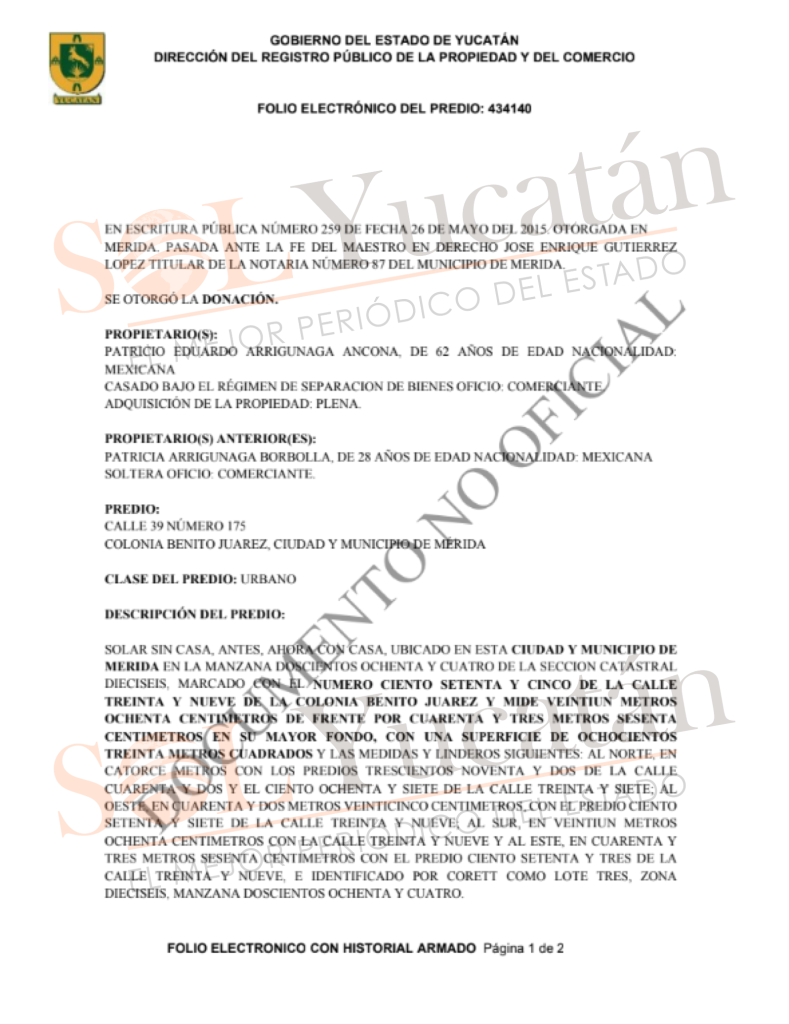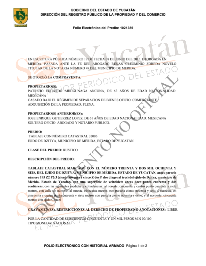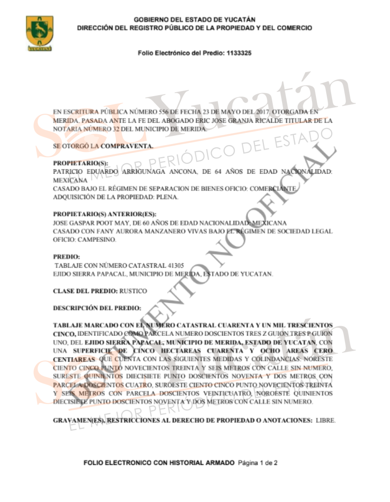 Y todo esto mientras recibe en donación una casa de 830 metros cuadrados en la Benito Juárez, adquiere tierra en Dzityá —territorio caliente para desarrolladores— y compra hectáreas completas en Sierra Papacal. Su patrimonio, tomando los valores más altos de mercado, rebasa los 43 millones de pesos. Y eso solo con lo que está plenamente documentado en el Registro Público. Nada garantiza que ahí termine la lista.