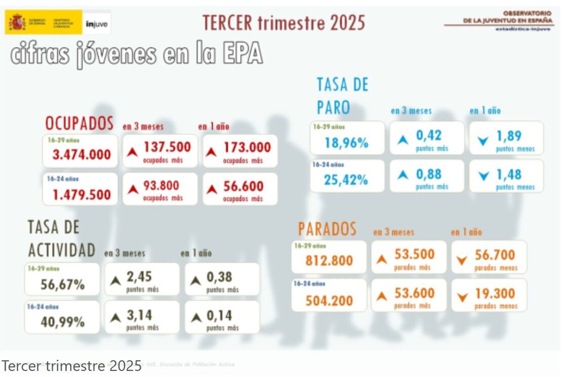 Otro factor que impide la convivencia de los jóvenes es el empleo. Según datos del Instituto Nacional de la Juventud (Injuve), la tasa de paro entre los menores de 30 años se situó en el 18,95% a cierre del tercer trimestre de este año. Mientras que el número total de parados menores de 25 años cerró noviembre en 188.392 personas, tras caer un 2,8%, señalan desde el Ministerio de Trabajo.