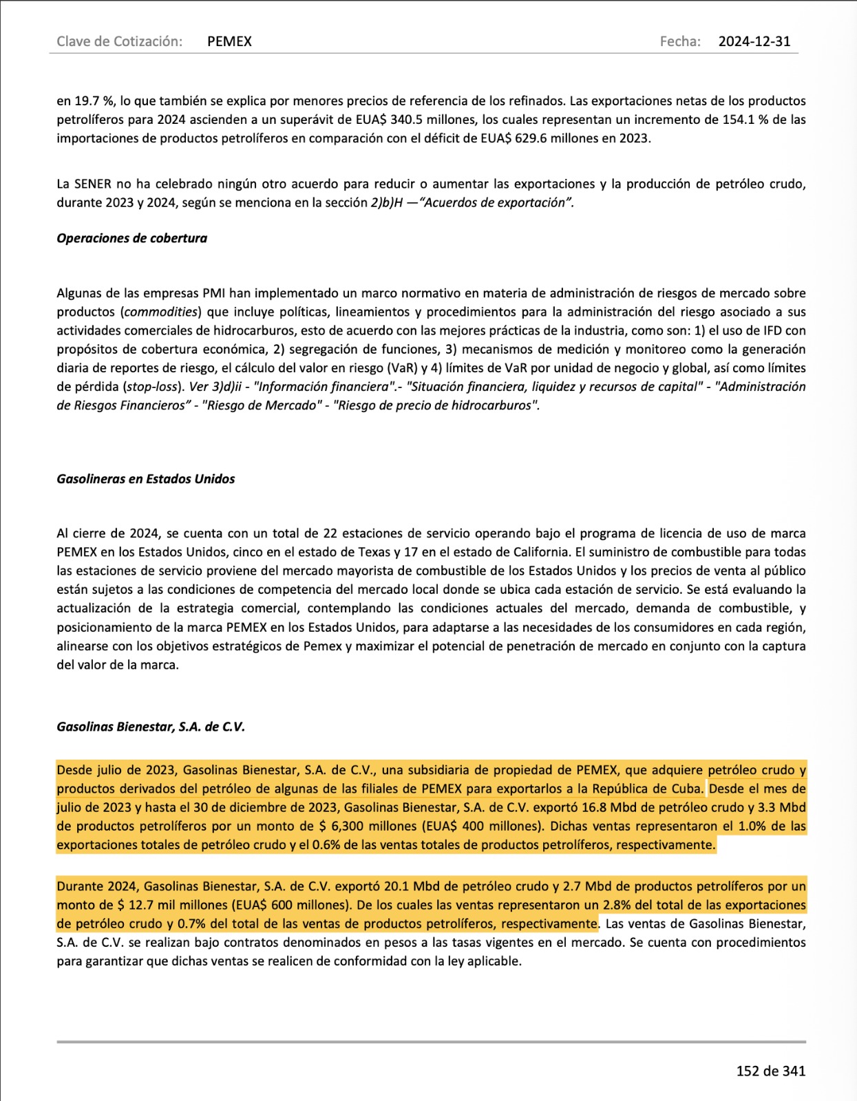 En su reporte anual, entregado a la Comisión Nacional de Bancaria y de Valores, PEMEX dice que "desde julio de 2023, Gasolinas Bienestar, S.A. de C.V., una subsidiaria de propiedad de PEMEX, que adquiere petróleo crudo y productos derivados del petróleo de algunas de las filiales de PEMEX para exportarlos a la República de Cuba".