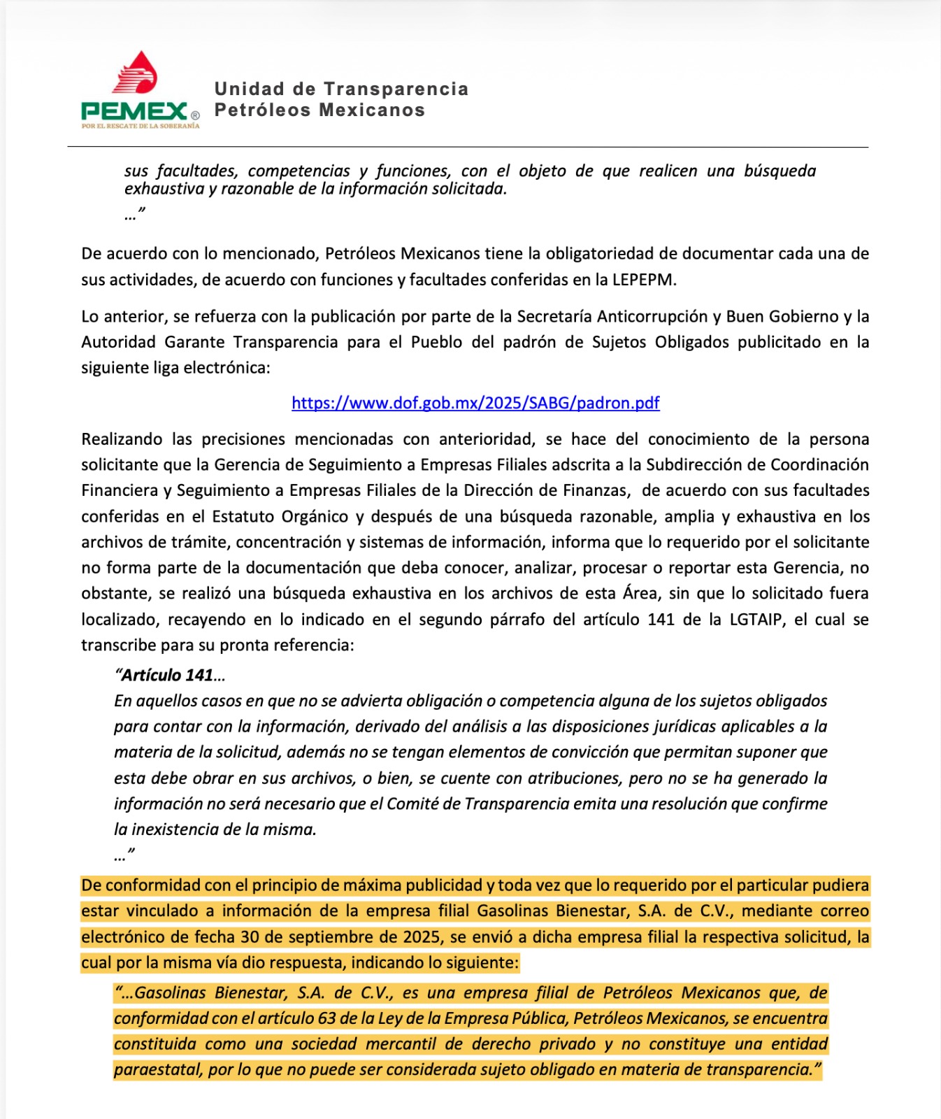 La realidad es que en la respuesta enviada vía transparencia a Meganoticias, que "Gasolinas Bienestar S.A de C.V., es una empresa filial de Petróleos Mexicanos que, de conformidad con el artículo 63 de la Ley de la Empresa Pública, Petróleos Mexicanos, se encuentra constituida como una sociedad mercantil de derecho privado y no constituye una entidad paraestatal, por lo que no puede ser considerada sujeto obligado en materia de transparencia".