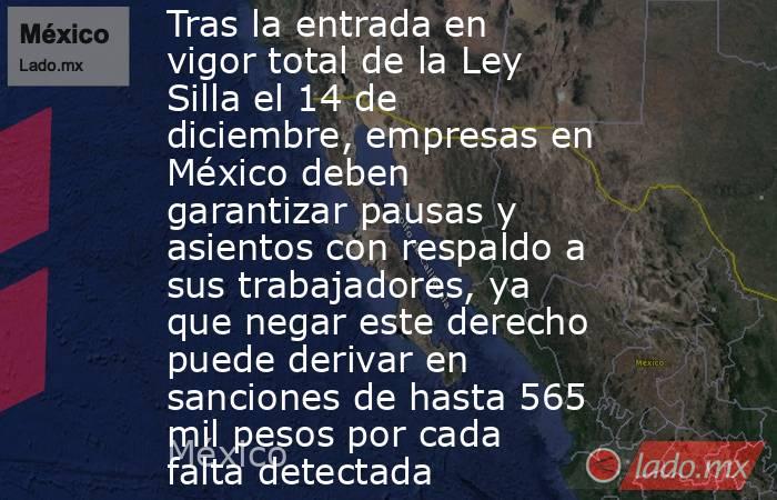 La Ley Silla es una reforma a la Ley Federal del Trabajo (LFT) que reconoce el derecho al descanso durante la jornada laboral, específicamente en una silla con respaldo. Esta regulación entró en vigor en dos etapas y, a partir del 14 de diciembre, es exigible en su totalidad, por lo que su incumplimiento puede derivar en multas de hasta 565,700 pesos, de acuerdo con El Economista.